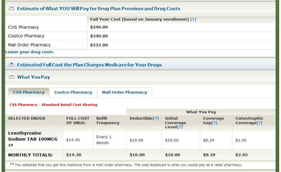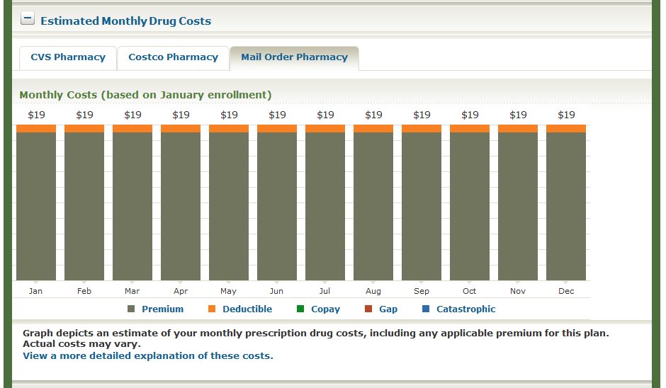 The previous window shows the estimated monthly cost (premium and deductible) for prescriptions through a mail order pharmacy.