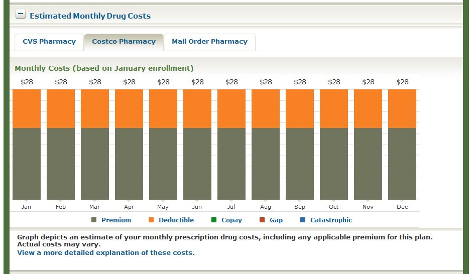 The previous window shows the estimated monthly cost (premium and deductible) for prescriptions at Costco Pharmacy.