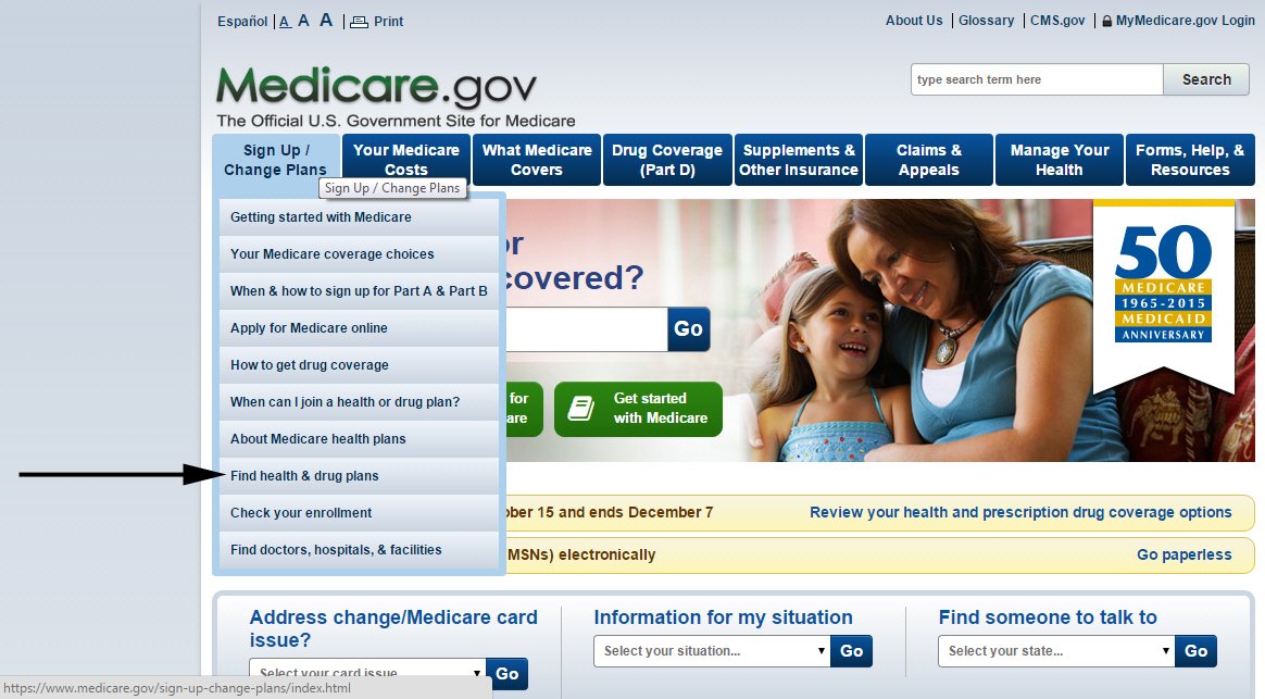 2.) Under the blue tab at the top left-side of page that says Sign Up/Change Plans, click Find health & drug plans.
